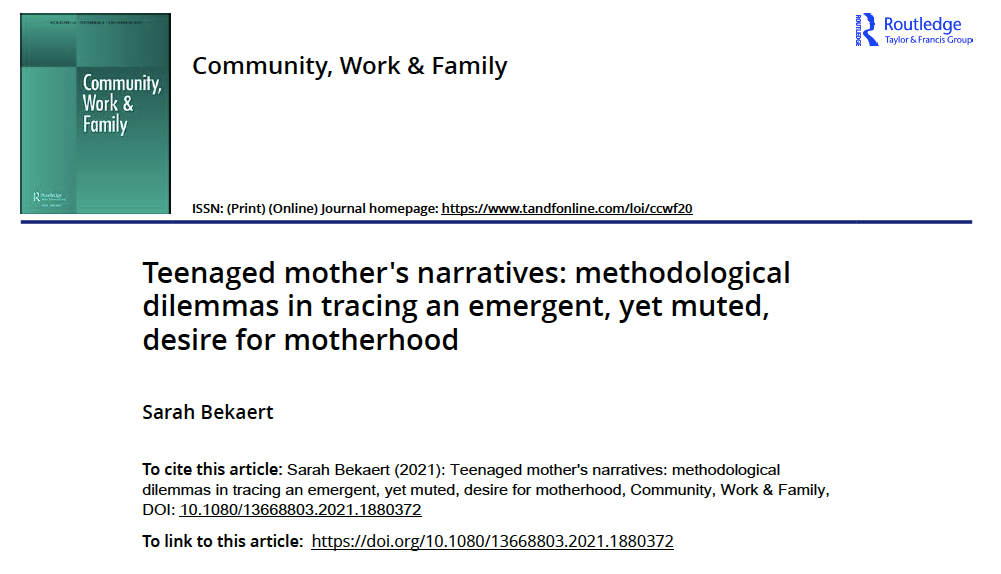 Bekaert, S. 2021. Teenaged mother’s narratives: methodological dilemmas in tracing an emergent, yet muted, desire for motherhood. Community, Work and Family.